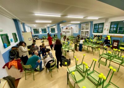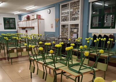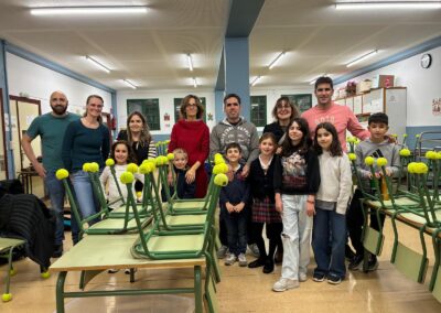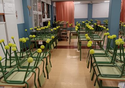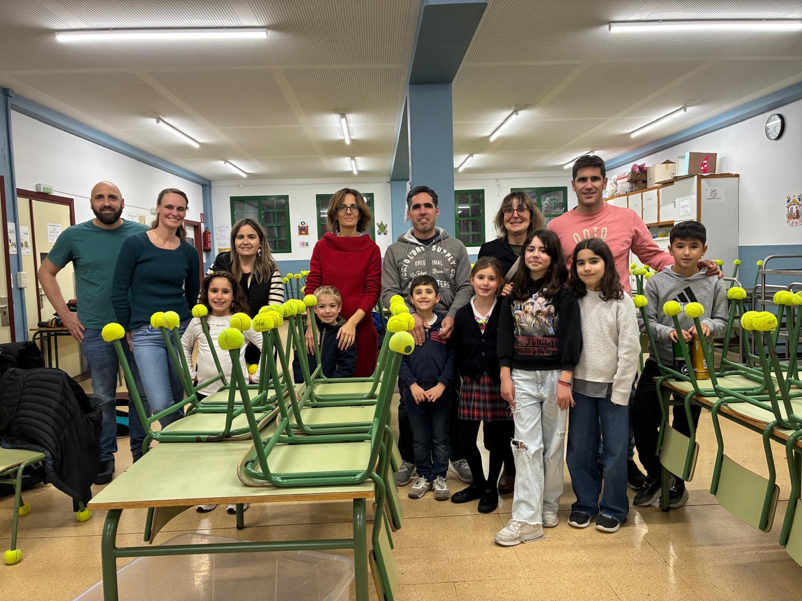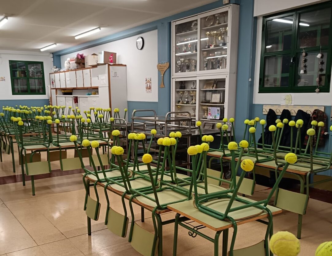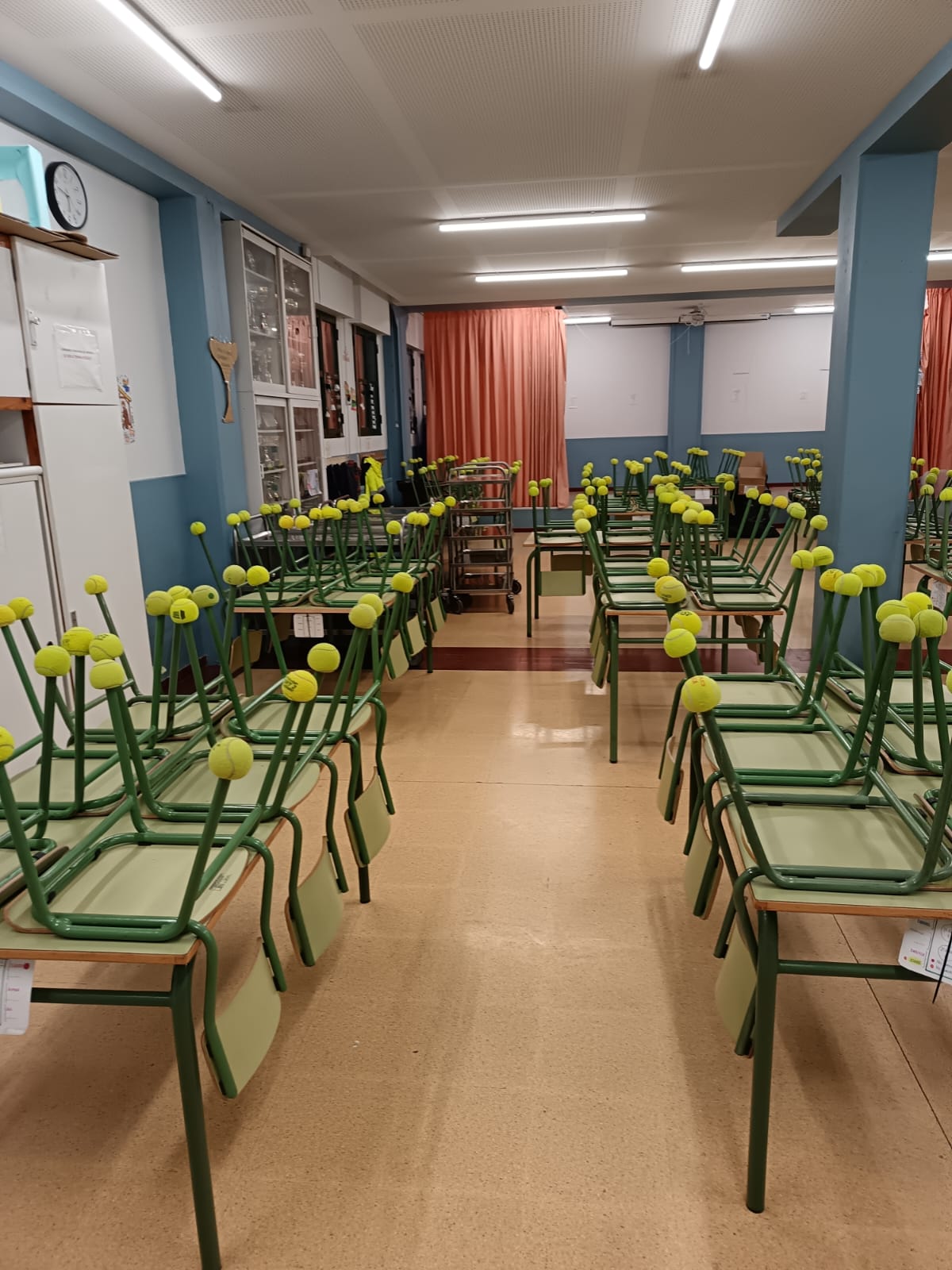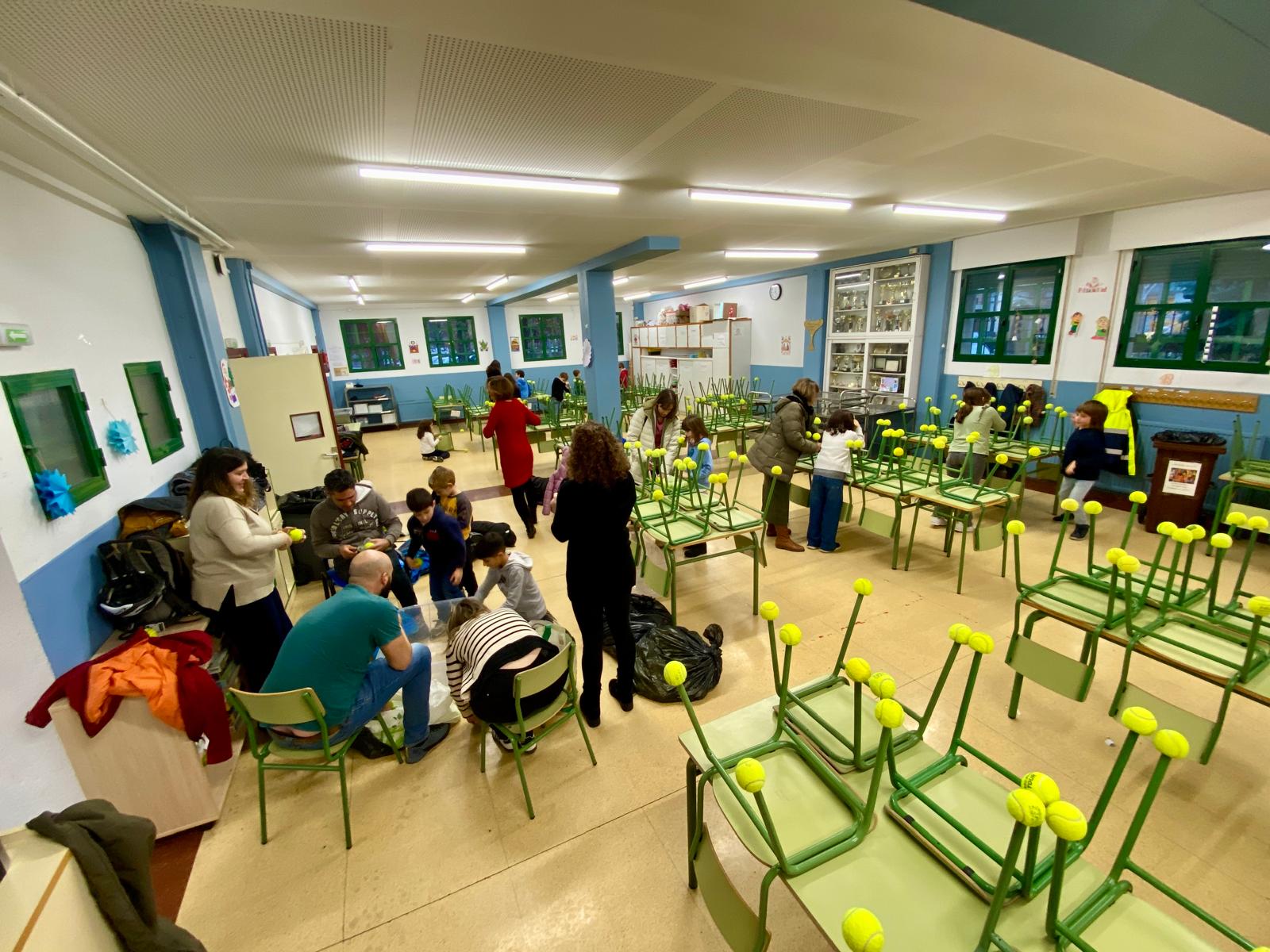 ¡Hoy día 16 de diciembre el comedor de primaria se ha llenado de pelotas de tenis! Varias familias, padres, madres, niñas y niños nos hemos juntado para colocar las pelotas en las sillas, y entre risas, algún que otro corte sin importancia… manos a la obra ¡hemos terminado en un abrir y cerrar de ojos!